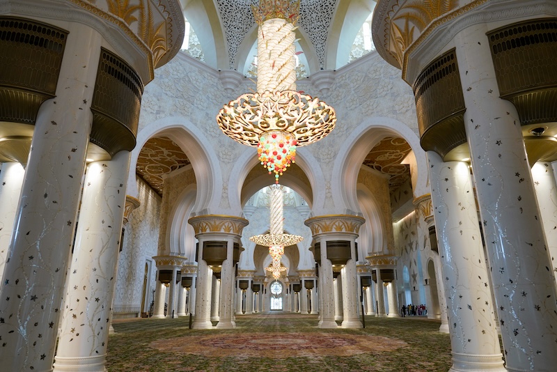 内部に足を踏み入れると、豪華絢爛な装飾に息をのむ。世界最大として知られるペルシャ絨毯は、1,200人もの職人が2年の歳月をかけて手織りした芸術品。また、ドイツ製の巨大なシャンデリアは、無数のスワロフスキー・クリスタルと24金で彩られ、祈りのホールに荘厳な光を投げかける。アブダビ観光スポットの大本命であるグランドモスク。ぜひとも訪問してもらいたい。