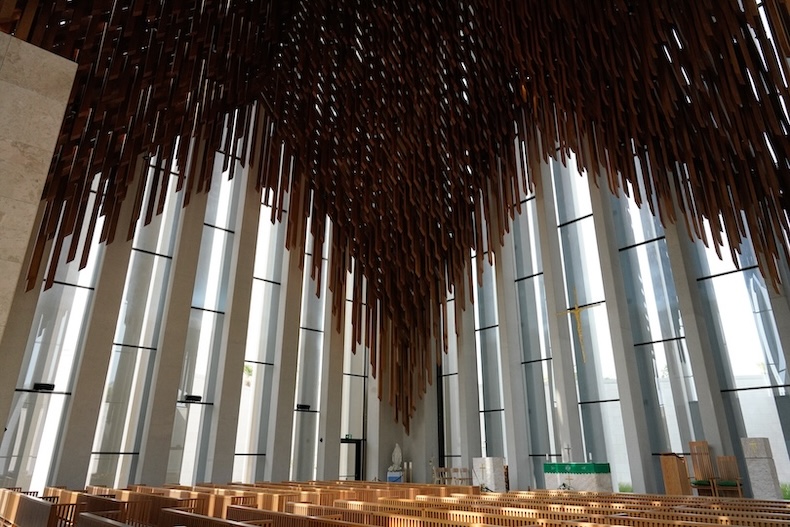82個の純白のドームが連なる姿は、まるで天空に浮かぶ宮殿。純白の大理石が外壁を覆い、日中は太陽の光を浴びてまばゆいばかりに輝き夜は月の満ち欠けに連動した照明「ルナ・ライティング」によって幻想的な青い光に照らし出される。