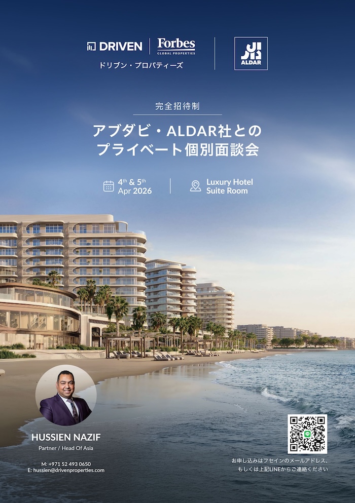 UAEの首都・アブダビを代表する政府系デベロッパー・ALDAR社が来日し、2026年4月4日(土)・5日(日)の2日間、東京都内のラグジュアリーホテル・スイートルームにて完全招待制のプライベート個別面談会が開催される。主催は、ドバイの大手不動産仲介会社ドリブン・プロパティーズ。