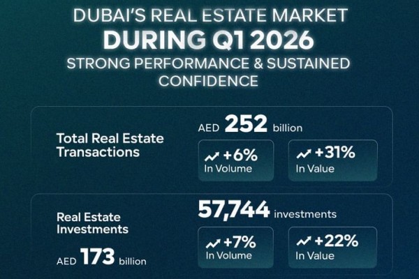 ドバイ土地局(DLD)が発表した2026年第1四半期の不動産市場統計によると、取引総額は前年同期比31%増の2,520億AED(およそ10兆800億円)に達し、過去最高水準を更新した。